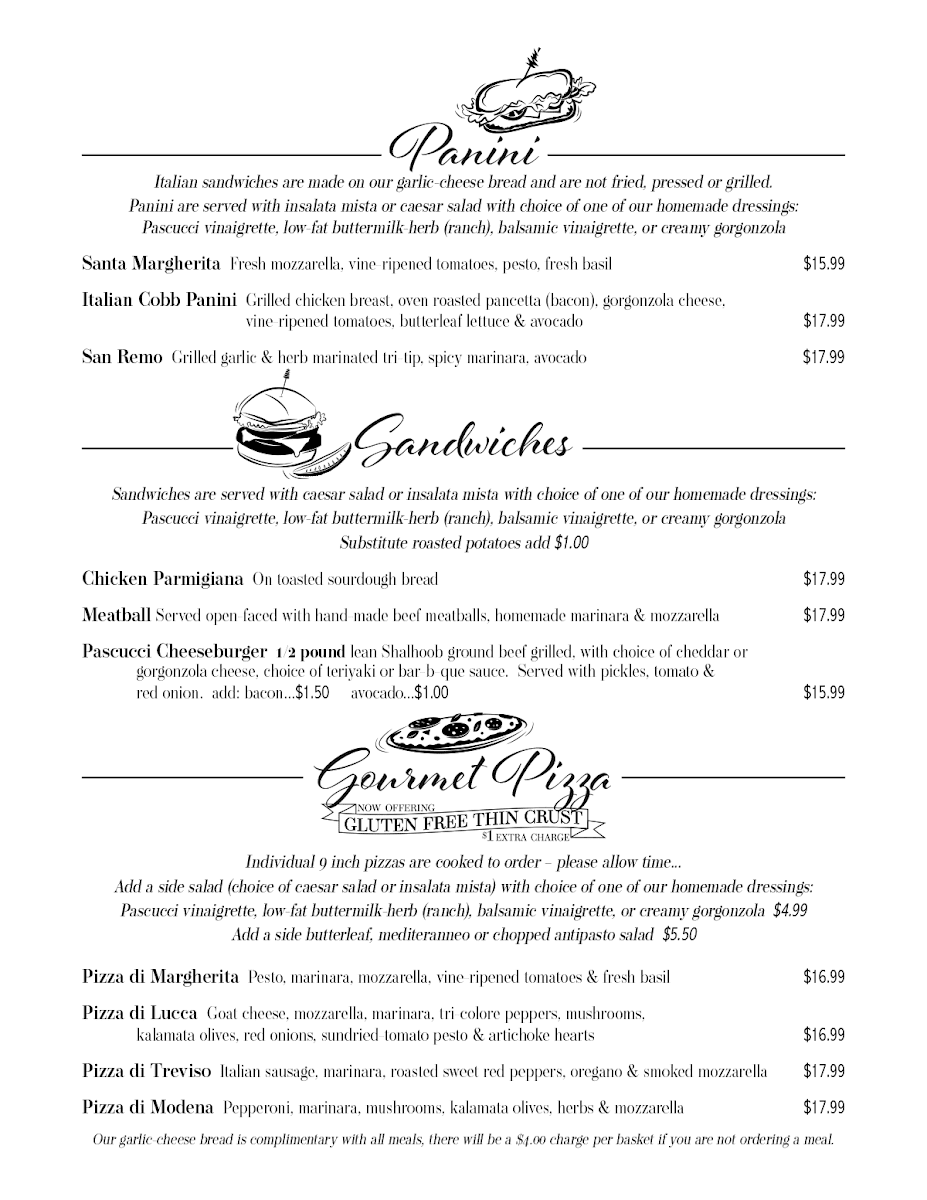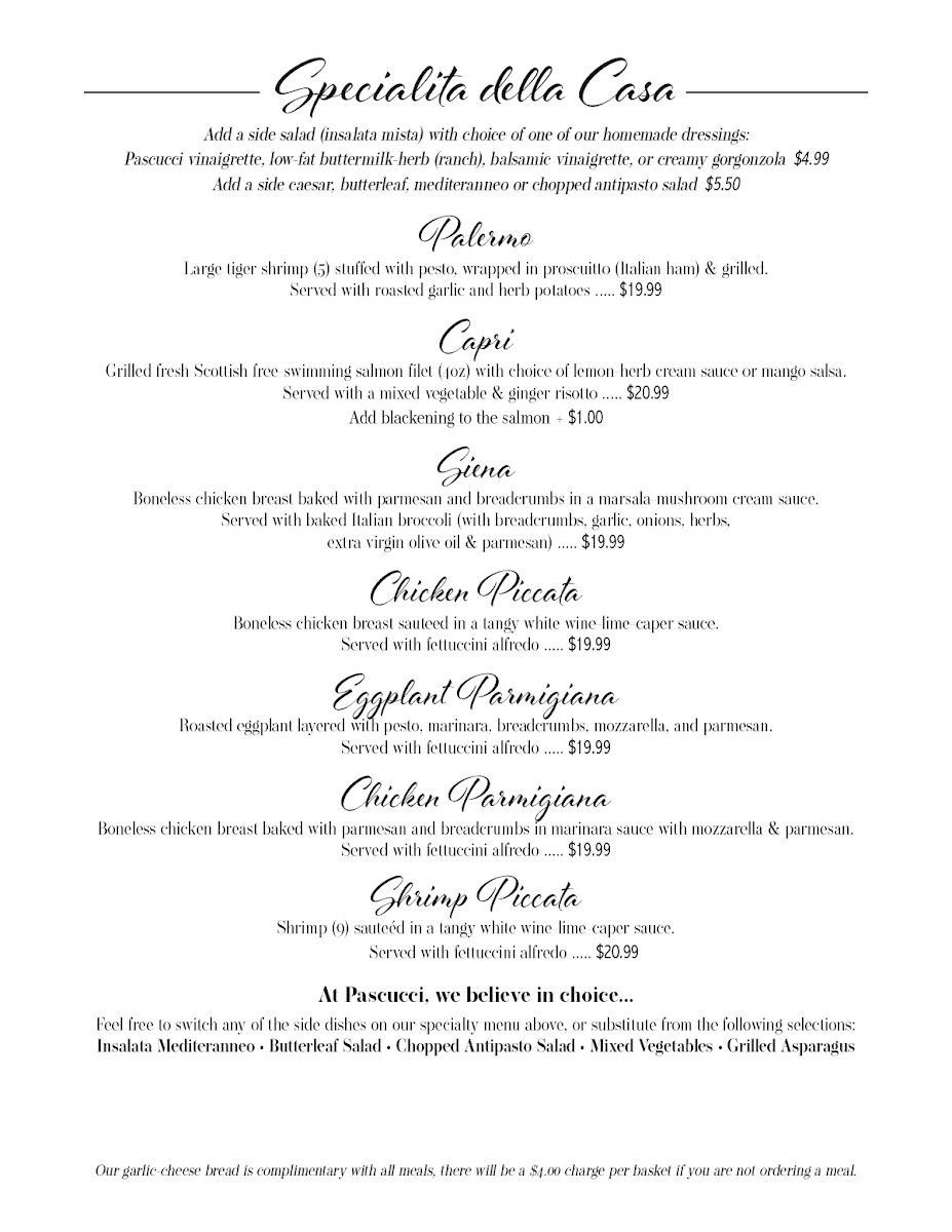 The menu features an array of options that cater to every palate. Highlights include the savory Pasta Pascucci, a customer favorite praised for its rich flavors, and the classic lasagna served with a refreshing salad. For those with a sweet tooth, their homemade cheesecake and Chocolate Turtle Tart promise to indulge your cravings.